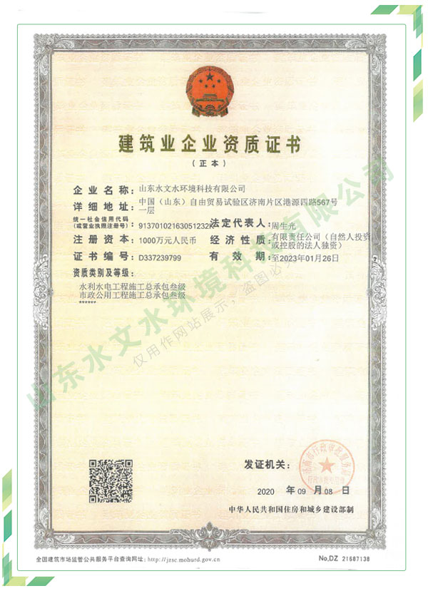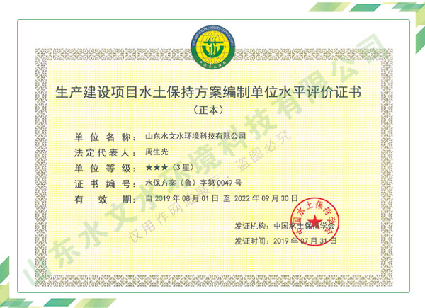 公司擁有水利工程設(shè)計、水土保持、水文水資源調(diào)查評價、水資源論證、建設(shè)項目環(huán)境影響評價、市政公用工程施工總承包、水利水電工程施工總承包、電子與智能化工程專業(yè)承包等資質(zhì),2017年通過質(zhì)量管理體系、環(huán)境管理體系、職業(yè)健康安全管理體系認(rèn)證;2020年被評為國家級高新技術(shù)企業(yè),同年被中國水利企業(yè)協(xié)會推薦為第一批“合同節(jié)水服務(wù)企業(yè)”;2021年被山東省、濟(jì)南市評為 “專精特新”中小企業(yè)。業(yè)務(wù)范圍涉及水利工程設(shè)計;節(jié)水設(shè)計、改造、水平衡測試;山洪災(zāi)害調(diào)查;城市水資源調(diào)查評價;建設(shè)項目水土保持方案編制、監(jiān)測、驗收、水土保持規(guī)劃;水安全保障規(guī)劃、建設(shè)項目水資源論證、規(guī)劃水資源論證;建設(shè)項目環(huán)境影響評價;入河排污口論證;防洪影響評價;市政公用工程施工、水利水電工程施工、電子與智能化工程施工等。